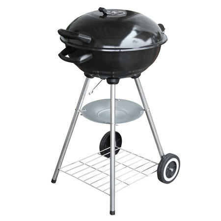 поддон для золы, колеса, воздушные заслонки, дополнительная решетка, откидная крышка, чаша гриля с жаропрочной эмалью; функции: барбекю, гриль, копчение, регулировка воздушного потока; дополнительная решетка для разогрева, диаметр решетки гриля - 430 мм, диаметр решетки для углей - 370 мм, высота зоны готовки 72 см, верхний и нижний обдув