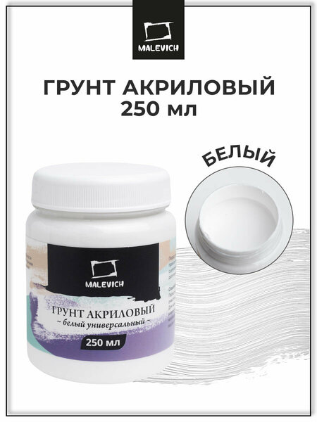 Универсальный акриловый грунт Малевичъ предназначен для подготовки к росписи холста, дерева, картона, папье-маше, оргалита, стекла, камня, металла или пластмассы. Подходит для живописи маслом, акрилом, гуашью, темперой и другими красками. Обеспечивает прочную связь красочного слоя и поверхности основы. Расфасовка по 250 мл будет удобна художникам, которые редко самостоятельно грунтуют холсты или тем, кто предпочитает небольшой формат живописи. Грунт представляет собой полужидкую пасту на основе дисперсии акриловой смолы и диоксида титана, включающую нейтральный наполнитель и вспомогательные вещества. При необходимости пасту можно разбавить водой до желаемой консистенции. Высыхая, грунт образует водостойкую эластичную матовую пленку белого цвета, придающую грунтуемой поверхности однородную плотность и шероховатость. Перед нанесением грунта поверхность необходимо очистить от грязи, пыли и жира, дерево предварительно ошкурить, холст – проклеить. Грунт наносится широкой плоской кистью или валиком в несколько слоев, каждый последующий слой – после полного высыхания предыдущего. Сушка должна производиться в естественных условиях. Начинать живопись можно примерно через двое суток после высыхания последнего слоя.