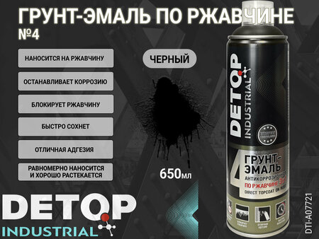 Аэрозольный грунт-эмаль №4 по ржавчине "3 в 1" DETOP INDUSTRIAL (DTI-A07721) выполняет функцию преобразователя ржавчины, антикоррозионного грунта и декоративной эмали. Применяется для покраски чугунных и стальных поверхностей с различной степенью коррозии: от следов коррозии до полностью покрытых ржавчиной, плотно сцепленной с металлом, толщиной до 70 мкм. грунт-эмаль №4 предназначена для защиты металлических конструкций промышленного назначения, очистка которых затруднена. Используется для окраски поверхностей, подвергающихся атмосферному воздействию, в том числе промышленной атмосферы, содержащей агрессивные газы и пары, соли и другие химические реагенты, имеющие температуру не выше 60°С. Объем баллона - 650мл. Цвет эмали - черный (RAL 9004). Особенности грунт-эмали №4 Detop: • Наносится прямо на ржавчину. • Отличная адгезия и укрывистость. • Превосходные антикоррозионные свойства. • Останавливает коррозию и блокирует ржавчину. • Равномерно наносится и хорошо растекается. • Быстро сохнет.