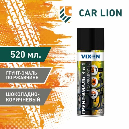 Аэрозольная грунт-эмаль по ржавчине VIXEN 4в1, шоколадно-коричневый RAL 8017, 520 мл VX518017 объединяет свойства грунта, антикоррозийного покрытия, декоративной эмали и защитного лака. Благодаря этому значительно сокращает время, которое обычно требуется для проведения каждой процедуры по отдельности (удаление ржавчины, грунтование и окрашивание). Предназначена для окрашивания заржавевших или подверженных коррозии поверхностей. Подходит для окрашивания поверхностей из металла, дерева, стекла и камня. Грунт-эмаль обладает хорошим сцеплением с окрашиваемой поверхностью даже при нанесении на ржавчину Образует прочное покрытие с долговременной защитой от коррозии, высокими декоративными свойствами и стойкостью к механическим и атмосферным воздействиям Не выгорает под действием УФ-лучей, не трескается и не отслаивается, сохраняет эластичность даже при отрицательных температурах Антикоррозийные компоненты, которые содержатся в грунт-эмали, защищают от коррозии, а при нанесении на ржавчину предотвращают коррозийный процесс Цветовая палитра грунт-эмали по ржавчине 4 в 1 VIXEN соответствует европейскому цветовому стандарту RAL. Может использоваться для внутренних и для внешних работ Грунт-эмаль по ржавчине 4 в 1 VIXEN позволяет легко и быстро восстановить поврежденную поверхность и обновить внешний вид окрашиваемого изделия. Краска обладает повышенной укрывистостью , благодаря чему экономична в использовании.