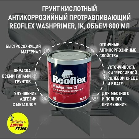 Грунт кислотный для авто Reoflex 1+1 Washprimer - универсальное средство для грунтовки различных поверхностей. Он обладает антикоррозийными свойствами и прекрасно защищает металлические детали от ржавчины. Грунт эффективно наносится на пластиковые поверхности, обеспечивая прочное сцепление и долговременную защиту. Состав грунта включает отвердитель, что позволяет обеспечить быстрое высыхание и отличную адгезию с последующими слоями краски. Благодаря своей экономичной расходности, грунт Reoflex 1+1 Washprimer является выгодным выбором для каждого автовладельца. Он легко наносится кистью или распылителем и обеспечивает ровное и гладкое покрытие. Грунтовка повышает адгезию краски к поверхности, улучшает ее стойкость и увеличивает срок службы автомобиля. Приобретайте грунт кислотный для авто Reoflex 1+1 Washprimer и обеспечьте надежную защиту вашего автомобиля от коррозии и внешних воздействий. RX P-04 Washprimer, Reoflex, Однокомпонентный фосфатирующий грунт CF Однокомпонентный фосфатирующий грунт обладает высокими антикоррозионными свойствами. Характеризуется отличной адгезией ко всем металлам. Не содержит хромaтов. Подложки, подготовка поверхности:- Старое покрытие - обезжиривание, обработка абразивом Р240 или матирующим полотном красного цвета, обезжиривание- ПЭ шпатлевка - обработка абразивом Р240, обезжиривание- Черная, оцинкованная, нержавеющая сталь, алюминий- обезжиривание, обработка матирующим полотном красного цвета, обезжириваниеНанесение: - Жизнеспособность: 8 часов при +20°С - Вязкость распыления (В3-4): 16" - 18" при +20°С - Диаметр сопла: 1,4 - 1,6 мм - Давление: 2,0 - 4,0 бар - Число слоёв:1 - Толщина одного слоя: 10 мкм- Теоретический расход: 1л на 10м2 (10 мкм)- Температура: от +15°С до +30°С- Относительная влажность воздуха: до 75%Сушка:- Воздушная сушка при +20°С: 45 минПоследующие покрытия: акриловые грунты, кроме акрилового грунта RX F-02Нельзя наносить ПЭ шпатлевки и эпоксидные грунтыСрок годности: 24 месяца