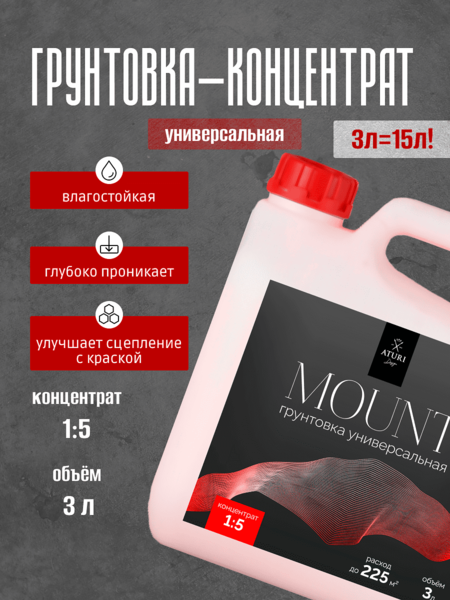 Грунтовка глубокого проникновения представляет собой универсальное средство, предназначенное для подготовки поверхностей перед внутренними и наружными отделочными работами. Это незаменимый инструмент для подготовки стен, потолка и пола из бетона, гипсокартона и других материалов перед покраской, поклейкой обоев или укладкой кафельной плитки. Наша грунтовка для стен - это основа, которая обеспечивает надежное сцепление между поверхностью и последующим покрытием. Она позволяет улучшить адгезию материалов и обеспечить ровное нанесение, что в свою очередь гарантирует качественный и долговечный результат. Это средство является одним из необходимых компонентов при ремонте и обновлении, оно образует защитный слой на поверхности, препятствуя поглощению красок или лаков. Благодаря грунтовке основание становится более износостойким и прочным. При обработке стен под обои она образует равномерное основание, сокращает расход клея и предотвращает образование пузырьков и микротрещин в процессе работы. Грунтовка под жидкие обои образует плотный и ровный слой, который создает равномерное поглощение влаги, повышает адгезию между обоями и стеной, что обеспечивает долговременную и качественную фиксацию. Для гипсокартона она выполняет ряд важных функций: повышает адгезию, увеличивает прочность и защищает от пыли и влаги. Грунт обеспечивает ровное нанесение штукатурки или краски, а также повышает сопротивление стен к механическим воздействиям. Применение нашего грунта особенно рекомендуется при работе со сложными поверхностями, такими как бетон, штукатурка, кирпич или газобетон. Адгезионный грунт предотвращает отслоение плитки от основания, его можно использовать перед выполнением ремонтных работ в ванных комнатах, кухнях или в других помещениях с высокими требованиями к влагостойкости материала. Этот продукт необходимо разводить перед применением, что делает его экономным. Грунтовка-концентрат глубокого проникновения от Aturi Design станет вашим надежным помощником в ремонте.