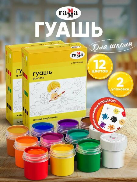 Гуашь бренда ГАММА серии Юный художник - это отличный выбор для всех, кто интересуется творчеством и хотел бы попробовать свои силы в изобразительном искусстве. Этот набор является неотъемлемой частью канцелярии и предназначен для использования в школе, на уроках изо или дома для самостоятельной работы, хобби. Гуашь для рисования в школу разработана совместно с педагогами специально для детей школьного возраста, канцелярия. А также может применятся как гуашь профессиональная, художественная для взрослых. Такой вид гуашевых красок на водной основе, что позволяет создавать различные эффекты и смешивать цвета для получения разнообразных оттенков. Они плотные и укрывистые, можно использовать в технике нанесения слоями, хорошо смешиваются, рисуют и равномерно наносятся на разные поверхности, такие как бумага, холст или картон. Детские краски для рисования производятся на основе качественного прозрачного связующего вещества, поэтому палитра цветов яркая, чистая и насыщенная. При высыхании создают плотный красочный слой с матовым бархатистым эффектом, не трескаются, не растекаются, не бликуют, быстросохнущая. Легко смываются с рук и одежды. Учебный процесс станет комфортным и интересным. Вы можете не беспокоиться о здоровье ребенка, ведь в составе только натуральные компоненты, высококачественные пигменты, безопасные, не вызовут раздражений при попадании на кожу, без запаха. Два комплекта из 12 цветов баночки по 17,5 мл станет незаменимым помощником для больших творческих работ и мастер классов. Есть белила для создания светлых тонов. Отличный подарок для малышей, для школьников, для студентов, для девочек и мальчиков, на праздники, 1 сентября, выпускной, день рождения, другу, подруге, дочке, сыну, можно брать с собой, для путешествий, для живописи, в дорогу, воображение, вдохновит на долгое время – будет заниматься часами! Товар сертифицирован, безопасен, произведен в России.