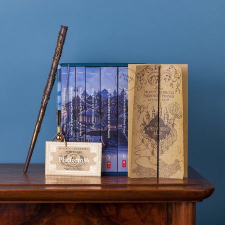 Комплект из 7 книг и картонный футляр + к комплекту идет один подарок (произвольно): карта мародеров, билетик на платформу, снитч или волшебная палочка