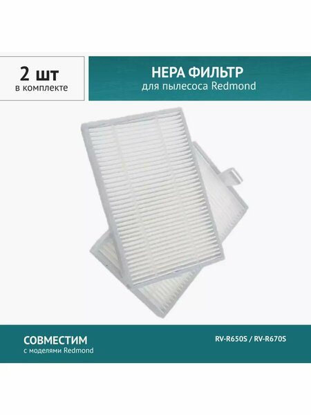 HEPA фильтр 2шт. для пылесоса Redmond RV-R650S / RV-R670S Во время работы пылесоса некоторое количество пыли попадает обратно в помещение, как правило, это самые мелкие частицы. Снизить уровень загрязнения воздуха помогут специальные фильтры, которые задерживают даже незначительные пылинки. нера фильтры обеспечивают эффективную очистку воздуха, значительно уменьшая попадание пыли, пыльцы, продуктов жизнедеятельности домашних животных и других аллергенов в воздух, которым вы дышите. Рекомендуется промывать фильтры один раз в месяц и менять каждые 2 - 3 месяца. Регулярная замена фильтров помогает поддерживать максимальную производительность Вашего пылесоса. Совместимость с моделями: Redmond RV-R650S / RV-R670S