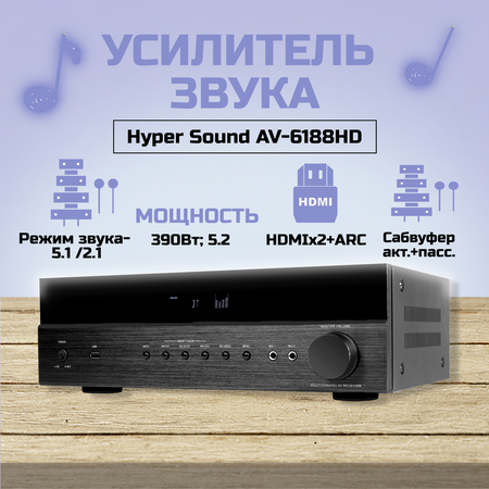 AV 6188 HD - это усилитель звука линейки Hyper Sound. В усилителе AV6188HD проработано внутреннее наполнение, теперь любые настройки, которые Вам так хотелось сохранить, будут в памяти девайса до момента, когда Вы сами захотите что-либо изменить, звук из колонок будет звучать мягко, а цифровой сигнал будет моментально считывать аудио сигнал. Система AV3188HD превосходно подойдет для домашнего кинотеатра, 5 выходов на колонки (SR/FL/SL/FR/CEN), сабвуфер пассивный + сабвуфер активный. Возможность подключения двух микрофонов, позволит прекрасно провести время исполняя любимые песни с системой караоке. Технические параметры: Общая выходная мощность составляет 390W FL/FR – 100W x 2 (4-16 Ω) CEN – 30W (4-16 Ω) SL/SR – 30W x 2 (4 – 16 Ω) SW – 100W (4 -16 Ω) Активный SW THD - < 0,5% Усилитель звука имеет встроенный декодер форматов MP3/WMA/WAV/APE/FLAC, достаточно вставить флешку с Вашими любимыми композициями и устройство начнет воспроизведение. Наличии Bluetooth версии 5.0 даст Вам удобство в использовании – слушайте музыку со смартфона или ноутбука в радиусе до 10 м. Усилитель имеет три цифровых входа Coaxial, Optical, DAC и USB; два HD выхода. Два аналоговых входа (AUX), ARC и может быть использован в качестве AV-ресивера, для вывода звука на колонки от TV приставки, телевизора, DVD плеера, FM-тюнера, компьютера, акустической системы, домашнего кинотеатра или караоке. Усилитель имеет эффект памяти, при выключении, он сохраняет выбранные заранее настройки. К усилителю можно подключить два микрофона, использовать его для Караоке или проведения мероприятий. Для микрофонов есть настраиваемый эффект Эхо (Echo). В усилители встроенный FM приемник с автопоиском и памятью станций. Чистое звучание музыки не оставит никого равнодушным. Отношение сигнал/шум: > 76дБ Входной интерфейс: USB/CD/AUX/Phono/DAC оптический/коаксиальный USB формат декодирования: APE/FLAC/WMA/MP3 Поддержка двух микрофонов