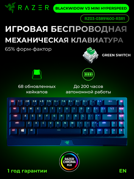 Игровая клавиатура Razer BlackWidow V3 Mini HyperSpeed - это сочетание стиля, функциональности и превосходного качества. Она предназначена для тех, кто ценит комфорт и производительность, и является отличным выбором для геймеров и профессионалов. Клавиатура оснащена механическими переключателями Razer Green Switch, которые обеспечивают плавное и точное нажатие клавиш. Благодаря этому, вы сможете быстро и без проблем выполнять сложные игровые задачи. Razer BlackWidow V3 Mini HyperSpeed имеет 68 клавиш, включая дополнительные клавиши и цифровой блок. Это позволяет вам легко переключаться между играми и рабочими приложениями. Клавиатура имеет RGB подсветку, которая может быть настроена в соответствии с вашими предпочтениями. Вы можете выбрать из 16,8 миллионов цветов и настроить эффекты подсветки, чтобы создать уникальную атмосферу. Razer BlackWidow V3 Mini HyperSpeed поддерживает подключение через USB и Bluetooth, что позволяет легко подключить клавиатуру к вашему компьютеру или мобильному устройству. Клавиатура изготовлена из прочного пластика и металла, что обеспечивает долговечность и надежность. Нескользящее основание гарантирует стабильность и безопасность использования. Razer BlackWidow V3 Mini HyperSpeed имеет гарантию на 2 года, что подтверждает качество и надежность продукта. Выбирая Razer BlackWidow V3 Mini HyperSpeed, вы получаете стильную, функциональную и надежную клавиатуру, которая станет незаменимым помощником в вашей игровой и профессиональной деятельности.