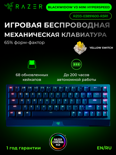 Игровая клавиатура Razer BlackWidow V3 Mini HyperSpeed - это сочетание стиля, функциональности и превосходного качества. Она предназначена для тех, кто ценит комфорт и производительность, и является отличным выбором для геймеров и профессионалов. Клавиатура оснащена механическими переключателями Razer Yellow Switch, которые обеспечивают плавное и точное нажатие клавиш. Благодаря этому, вы сможете быстро и без проблем выполнять сложные игровые задачи. Razer BlackWidow V3 Mini HyperSpeed имеет 68 клавиш, включая дополнительные клавиши и цифровой блок. Это позволяет вам легко переключаться между играми и рабочими приложениями. Клавиатура имеет RGB подсветку, которая может быть настроена в соответствии с вашими предпочтениями. Вы можете выбрать из 16,8 миллионов цветов и настроить эффекты подсветки, чтобы создать уникальную атмосферу. Razer BlackWidow V3 Mini HyperSpeed поддерживает подключение через USB и Bluetooth, что позволяет легко подключить клавиатуру к вашему компьютеру или мобильному устройству. Клавиатура изготовлена из прочного пластика и металла, что обеспечивает долговечность и надежность. Нескользящее основание гарантирует стабильность и безопасность использования. Razer BlackWidow V3 Mini HyperSpeed имеет гарантию на 2 года, что подтверждает качество и надежность продукта. Выбирая Razer BlackWidow V3 Mini HyperSpeed, вы получаете стильную, функциональную и надежную клавиатуру, которая станет незаменимым помощником в вашей игровой и профессиональной деятельности.