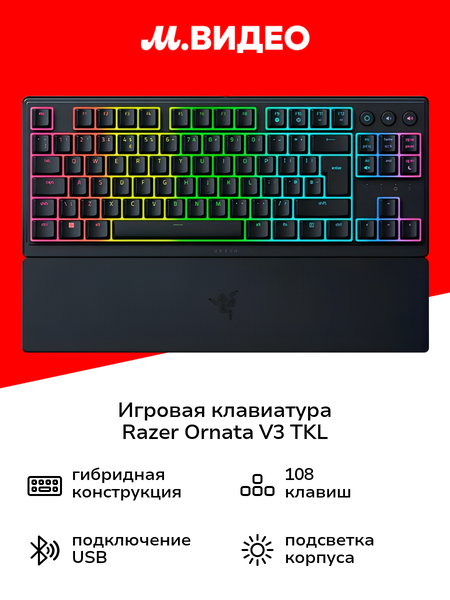 Игровая клавиатура Razer Ornata V3 Tenkeyless (RZ03-04881600-R3R1) - модель с габаритными размерами 3,1х14,4х36,3 см, весом 644 г. Устройство в пластиковом корпусе с широкой съемной подставкой для кистей рук, обеспечивающей оптимальное положение и уменьшение нагрузки на запястья. Низкопрофильные 108 механическо-мембранных клавиш отличаются плоской поверхностью и быстрым откликом на касания. Предусмотрена кнопка Windows. Наличие цифрового блока упрощает ввод числовой информации. RGB-подсветка позволяет эксплуатировать клавиатуру в условиях плохого освещения. Конструкцией предусмотрены световые индикации индикация Caps Lock, Num Lock. Для синхронизации с устройствами используется USB-кабель длиной 2 метра.