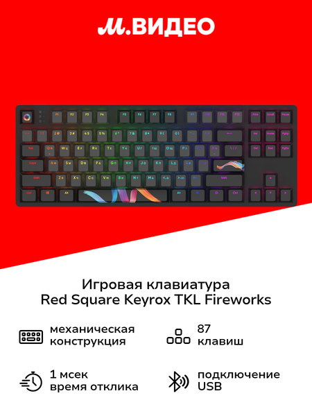 Игровая клавиатура Red Square Keyrox TKL Fireworks RSQ-20037 подсоединяется к персональному компьютеру с помощью провода с тканевой оплеткой 1,8 м через USB-порт 2.0. На корпусе размещены 87 клавиш с антигостингом. 86 клавиш оснащены функцией программирования. Встроенная RGB-подсветка обеспечивает удобную навигацию по клавиатуре. Добавлена клавиша Windows. Сила нажатия - 50 г. Время отклика - 1 мс. Индикаторы отражают информацию о включении, Caps Lock и Num Lock. Модель выполнена в стильном черном корпусе, изготовленном из пластика и металла. Габариты - 2,3х35,7х13 см. Вес - 880 г.