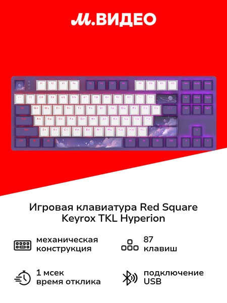 Игровая клавиатура Red Square Keyrox TKL Hyperion RSQ-20039 подсоединяется к персональному компьютеру с помощью провода с тканевой оплеткой 1,8 м через USB-порт 2.0. На корпусе размещены 87 клавиш с антигостингом. 86 клавиш оснащены функцией программирования. Встроенная RGB-подсветка обеспечивает удобную навигацию по клавиатуре. Добавлена клавиша Windows. Сила нажатия - 50 г. Время отклика - 1 мс. Индикаторы отражают информацию о включении, Caps Lock и Num Lock. Модель выполнена в стильном фиолетовом корпусе, изготовленном из пластика и металла. Габариты - 2,3х35,7х13 см. Вес - 880 г.