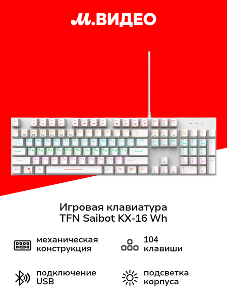 Игровая клавиатура TFN Saibot KX-16 белого цвета обладает габаритами 12,4х3,5х41,4 см. Встроен кабель USB 2.0 длиной 1,5 м. Разъемы выполнены из никелированной стали. Присутствуют индикаторы включения, клавиши Caps Lock и Num Lock. Корпус выполнен из металла и пластика. В наличии 104 клавиши механического типа с подсветкой RGB. Клавиатура оснащается системой переключателей Outemu Red Switch. Присутствует кнопка Windows.