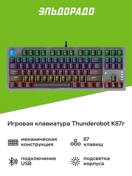 Thunderobot K87R (JM03NME07RU) черного цвета - механическая компактная (TKL) игровая клавиатура. Модель предусматривает проводное соединение и подключается к ПК через интерфейс USB. Кабель длиной 1,5 м обеспечивает удобство использования устройства. Клавиатура оснащена клавишами с силой нажатия 45 г, что обеспечивает быструю и точную реакцию. Корпус модели выполнен из легкого и прочного пластика. Клавиатура оснащена 87 клавишами и подсветкой RGB с возможностью настройки цветов.