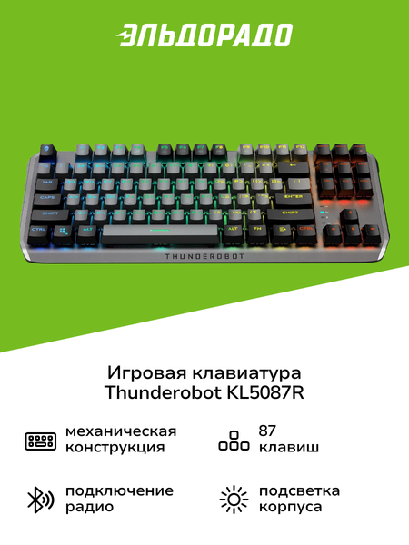 Игровая клавиатура Thunderobot KL5087R JM03NPE03RU подключается к устройству через USB-кабель (длина - 1,5 м, включен в комплект) или посредствам радиомодуля. Гарантия эксплуатации от производителя - 1 год. Кнопки модели - механические, присутствует клавиша Windows, всего функциональных клавиш - 87 шт. Встроена RGB-подсветка. Необходимое для работы программное обеспечение расположено на интернет-сайте производителя. Корпус высотой 3,9 см, шириной 37,8 см, глубиной 14,5 см изготовлен из серого пластика. Вес клавиатуры - 0,765 г.