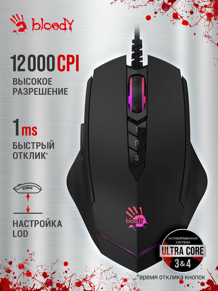 Игровая мышь A4Tech Bloody V8M Max — отличный выбор для любителей компьютерных игр. Она оснащена кастомизированным сенсором Max BC3332-A с улучшенной производительностью, который позволяет регулировать частоту опроса от 125 до 2000 Гц и разрешение от 100 до 12 000 CPI по осям X и Y. Мышь также имеет настройку высоты отрыва (LOD) и ускорение 35 G. V8M Max поставляется с активированной системой Ultra Core 3&4, которая предоставляет пользователю четыре уровня настройки: низкий, высокий, ультра и экстремальный. Мышь можно настроить под различные игровые жанры, включая MMO, RPG и FPS. 5-позиционная калибровка помогает улучшить баллистические характеристики, а быстрое переключение между снайперскими режимами левой кнопки полезно в многопользовательских онлайн-шутерах. На корпусе мыши расположено 10 кнопок, включая возможность назначать несколько последовательных действий на одно нажатие. Для хранения макросов используется память на 4 МБ. Левая и правая кнопки выдерживают более 20 миллионов нажатий, а колесо прокрутки рассчитано на более 800 тысяч оборотов. Стильный дизайн корпуса дополняется 6-зонной RGB подсветкой с пятью загруженными профилями. Металлические ножки X’ Glide обеспечивают комфортную управляемость на любой поверхности, а для подключения используется 1,8-метровый кабель.