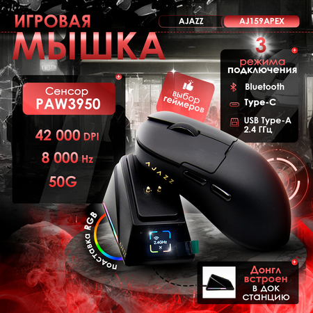 Игровая мышь AJAZZ AJ159APEX с док-станцией — мышь, которая создана для настоящих геймеров. В оснащение модели входит высокотехнологичный сенсор PixArt PAW3950, обеспечивающий идеальную точность, моментальную реакцию и высокую производительность даже в самый напряженный момент игры. Представьте, как классно было бы не только играть за героя вашей любимой игры, но и иметь возможность поставить на экран вашей мышки любое GIF изображение с вашим любимым персонажем. AJAZZ AJ159APEX предоставляет такую возможность с помощью усовершенствованного TFT дисплея последнего поколения. Экран также обладает информационной функцией. Дисплей показывает дату и время, способ подключения, частоту опроса, интенсивность чувствительности DPI, регулировку стоп-вылета LOD. Скачайте ПО на официальном сайте AJAZZ и настройте мышь и TFT дисплей док-станции по своим предпочтениям. Благодаря собственному ПО вы легко сможете регулировать чувствительность мыши DPI, программировать макросы, и подбирать наиболее подходящие для вас световые эффекты RGB подсветки док-станции. Док-станция с RGB подсветкой украсит ваш рабочий стол различными переливами цветов и поможет погрузиться в яркую атмосферу мира гейминга. Отрегулируйте цвет, яркость и направление RGB подсветки с помощью официального ПО AJAZZ. Помимо мыши и док-станции, в комплект также входят антискользящие грипсы, предназначенные для улучшения хвата мыши и снятия нагрузки на кисть во время игры. AJAZZ AJ159APEX совместима с операционными системами Windows и MacOS. Для подключения игровой мыши к компьютеру воспользуйтесь Bluetooth соединением, входящим в комплект кабелем USB Type-C или док-станцией 2.4 ГГц. Магнитное крепление док-станции служит для зарядки игровой мыши и способствует удержанию заряда устройства от 7 и более дней. Благодаря компактному размеру и возможности беспроводного управления, игровая мышь не будет занимать много места на вашем столе и освободит пространство для других устройств, необходимых для гейминга. AJAZZ AJ159APEX — это сочетание исключительной точности, плавного управления, стильного дизайна и высокой производительности, которое станет отличным дополнением к арсеналу любого геймера. Постигайте любые цели, выходите на новые уровни и наслаждайтесь игрой вместе с игровой мышью AJAZZ AJ159APEX.