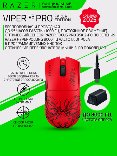 Особенности - Сверхлегкий дизайн 54 грамма - Оптический сенсор Razer Focus Pro 35K 2-го поколения - Технология беспроводной связи Razer HyperPolling 8K Гц - Беспроводная связь 2,4ГГц или проводной режим - технические характеристики - Форм-фактор: симметричный для правой руки - Два режима работы: Беспроводная связь Razer HyperPolling (2.4 ГГц) или проводной режим - Оптический сенсор Focus Pro 35K с разрешением 35 000 DPI 2-го поколения - Скорость до 750 дюймов в секунду / Ускорение до 70 g - Частота опроса до 8000 Гц с беспроводным передатчиком Razer HyperPolling Wireless Dongle (входит в комплект) - 6 программируемых кнопок - Оптические переключатели для мышей Razer Gen-3 (3-го поколения) с ресурсом 90 млн нажатий - Колесо прокрутки тактильное игрового класса - Настройка чувствительности на лету On-The-Fly Sensitivity, стандартные уровни чувствительности: 400 / 800 / 1600 (по умолчанию) / 3200 / 6400) - Встроенная память на 1 профиль и облачное хранилище - Расширенные возможности настройки расстояния отрыва/приземления - Калибровка сенсора под поверхность - Поддержка программы управления Razer Synapse 3 - Подсветка Razer Chroma RGB отсутствует - Ножки мыши из 100% фторопласта (PTFE) - USB передатчик 2,4 ГГц Razer HyperPolling Wireless Dongle в комплекте - Кабель сверхгибкий Speedflex длиной 1,8 м для зарядки и использования мыши в проводном режиме, USB Type C - USB - Совместимость с зарядными станциями: Нет - Время работы от аккумулятора: до 95 часов (1000 Гц, постоянное движение) - Время работы от аккумулятора: до 62 часов (2000 Гц, постоянное движение) - Время работы от аккумулятора: до 40 часов (4000 Гц, постоянное движение) - Время работы от аккумулятора: до 17 часов (8000 Гц, постоянное движение) - Зарядка полностью разряженной батареи длится приблизительно 4 часа - Примерные размеры: 128 x 64 x 40 мм - Примерная масса (без кабеля): 54 г черная модель, 55 г белая модель. - КАК заряжать мышь? - Мышь Razer Viper V3 Pro заряжается только по кабелю. - Мышь Razer Viper V3 Pro не поддерживает док-станцию Razer Mouse Dock Chroma (RC30-03050200-R3M1), док-станцию Razer Mouse Dock Pro & Wireless Charging Puck (RZ81-01990100-B3M1) и шайбу для зарядки Razer Wireless Charging Puck (RC21-01990200-R3M1). - системные требования - ПК со свободным USB-портом - требования К приложению RAZER SYNAPSE 3 - Windows 10 64 бит (или более новая версия) - Подключение к Интернету - 500 МБ свободного места на жестком диске - комплектация - Razer Viper V3 Pro - Razer HyperPolling Wireless Dongle - Кабель USB Type A к USB Type C - Razer Mouse Grip Tape - Важная информация о продукте