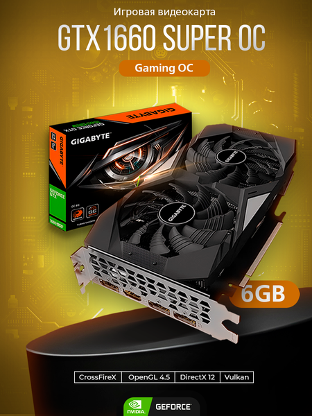 Данные видеокарты восстанавливаются на профессиональных и специализированных заводах Китая, что обеспечивает на 99% новое состояние. Видеокарта GIGABYTE GeForce GTX 1660 SUPER OC [GV-N166SOC-6GD 1.0], для подключения которой используется интерфейс PCI-E 3.0, не имеет поддержки мультипроцессорной конфигурации. Модель базируется на широко распространенном графическом процессоре GTX 1660 SUPER. Поддерживаются стандарты Vulkan 1.2, OpenGL 4.6 и DirectX 12. Совокупность технических характеристик делает оправданным использование устройства в составе игрового компьютера среднего уровня. Вы сможете использовать большинство популярных видеоигр. Видеокарта GIGABYTE GeForce GTX 1660 SUPER OC [GV-N166SOC-6GD 1.0] отличается компактностью. Длина устройства, равная лишь 225.65 мм, дает возможность использовать компактный корпус. Вам не потребуется большое количество свободных слотов расширения: адаптеру, толщина которого равна 40.5 мм, требуются только 2 слота. Потребляемая мощность модели может достигать 150 Вт. Минимально допустимая выходная мощность источника питания – 450 Вт. За охлаждение видеоадаптера отвечают два крупных, но не отличающихся существенным уровнем шума осевых вентилятора.