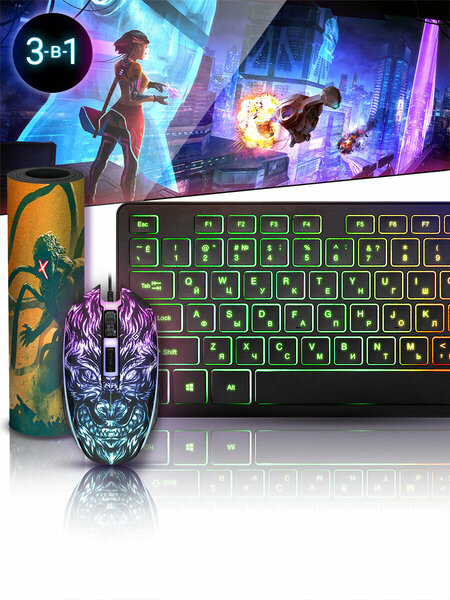 Игровой набор 3-в-1: мышь, клавиатура и ковер для мыши: 4 режима разрешения мыши 800/1200/1600/2400 dpi; Программное обеспечение Defender Game Center; Редактор макросов; Встроенный редактор макросов позволяет записывать и редактировать последовательности до 52 команд с возможностью зацикливания; Эмуляция клавиш клавиатуры; Пользователь может установить функции любых клавиш клавиатуры на кнопках мыши; Переливающаяся подсветка; Прочное, приятное на ощупь прорезиненное покрытие; Размер 280х230x3 мм; Гладкое покрытие; Точное позиционирование курсора и оптимальное трение; Нескользящая каучуковая основа; Надежно фиксируется на любой поверхности; Оптимальная толщина ковра - 3 мм; Отличное шумопоглощение при приземлении мыши и сглаживание мелких неровностей поверхности стола; Радужная подсветка; Возможность выключения подсветки; Ударопрочная конструкция; Классическая раскладка; Увеличенная площадь клавиш-модификаторов (Ctrl, Shift), клавиш Enter и BackSpace; Подсветка символов и клавиш; Подсветка включается и выключается одним нажатием клавиши Scroll Lock. Совместимость с Windows 2000/XP/Vista/7/8/10/11.