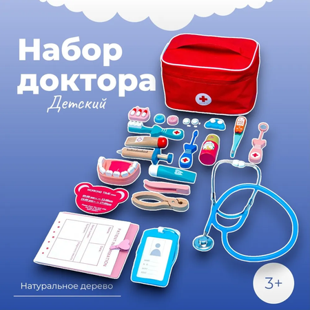 Детский набор доктора создан для сюжетной игры. Малыш примерит на себя роль врача и будет проводить осмотр пациентов. Кейс с лекарствами и инструментами доктора поможет ребёнку почувствовать себя настоящим врачом, который лечит людей. Игрушка выполнена из прочного и экологичного материала — дерева, — и покрыта нетоксичными красками, поэтому безопасна для здоровья малыша. Рекомендовано для детей от 3 лет. В наборе: челюсть — 1 шт. зубы — 9 шт. ножницы — 1 шт. шприц — 1 шт. щипцы — 1 шт. пинцет — 1 шт. паста — 1 шт. мазь — 1 шт. палочка с зеркалом — 1 шт. мед. ложка — 1 шт. щётка — 1 шт. стетоскоп — 1 шт. термометр + 3 табло — 4 шт. табличка — 1 шт. планшетка — 1 шт. карандаш — 1 шт. скальпель — 2 шт. ложечки — 3 шт. чемоданчик — 1 шт.