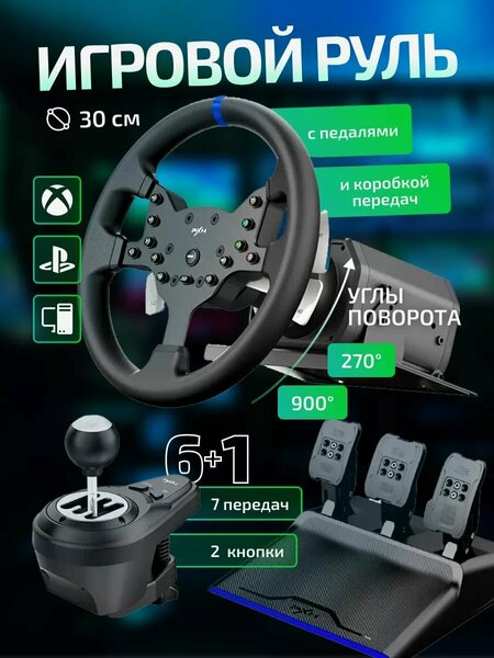 Игровой руль с педалями PXN V99 для PC/ PS4/ Xbox-One/ Xbox Series X/S обеспечивает долговечность и надежность в использовании. Диаметр рулевого колеса составляет 30 см, что обеспечивает удобный и уверенный захват во время игры.