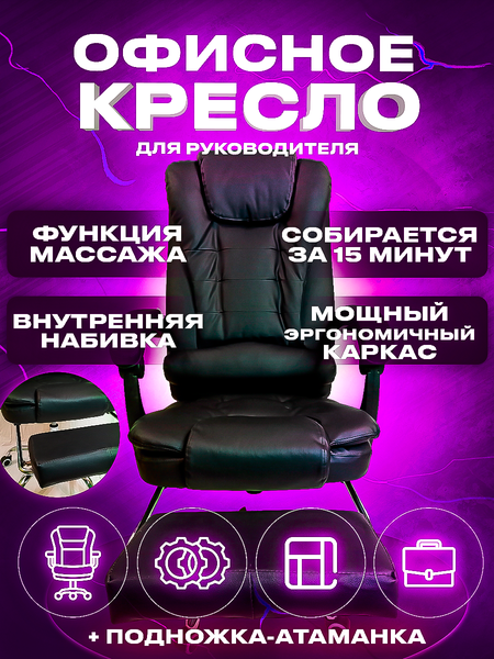Усиленное компьютерное кресло. Может быть использовано как надёжное офисное кресло или же, дома, в уютных посиделках, как игровое или геймерское кресло. Конструкция офисного кресла усилена до 200кг в среднем. Так же обивка надёжная – данные офисные кресла в ткани или компьютерные кресла в кожзаме – выдерживают до 8-10 лет пользования. Выдерживает нагрузку до 250 кг спокойно - крестовина цельносварная, металлческая, хромированная. Газлифт III степени. (За 4е года практики ремонта кресел, за заменой металл крестовины обратились раза 3и от силы, ибо металл устойчивее к динамическим нагрузкам). Очень ценная функция данного креслица - вибромассаж. В каркасе встроено 2а вибро блока. Да, сравнивать с проф массажными креслами не уместно, но через слой кофта+куртка - ощущается внушительно. Отлично воздействует на спину, при длительном сидении 100% оцените данную опцию. Иногда включить на 10мин - милое дело. Обивка кожзам - плотный, толстый (видно по сгибу). 10тыс. циклов на истирание по тесту Мартиндейла. По живучести (из опыта переобивки кресел), в рамках домашнего использования 5-8 лет вполне прослужит. В условиях офиса - поменьше. Отлично чистится мыльным раствором. Отстрочка на производственных швейных машинах (другие подобную толщину не возьмут). По набивке - мебельный поролон 25 плотности (наивысшей для мебели) верхняя проложка - синтепух (плотность 1000г\м), кресло не "сдуется" на 1й или 5й год использования. Кто любит помягче, самое то. Мягкость, в сравнении с иными креслами - высокая. Сидишь с комфортом, как в любимом домашнем кресле. Как на перине. Удобная регулировка по наклону - с возможностью фиксации в любом (!) удобном вам положении до 150гр. Спинка регулируется по высоте, с возможностью фиксации в любом (!) удобном для вас положении. На рост 150-185см весьма комфортно (из опыта ведения точки самовывоза) Регулировка базы (сидушки) по высоте. Фиксация в удобном положении. Штоки роликов и сами ролики - усиленные, так же под бОльший вес до 250кг. выдерживает нагрузку до 250кг, вибромассаж, подножка выдвижная. Инструкция по сборке (болты\ключ) в комплекте. Соберёте за 10 минут выдерживает нагрузку до 250кг, вибромассаж, подножка выдвижная. Инструкция по сборке (болты\ключ) в комплекте. Соберёте за 10 минут
