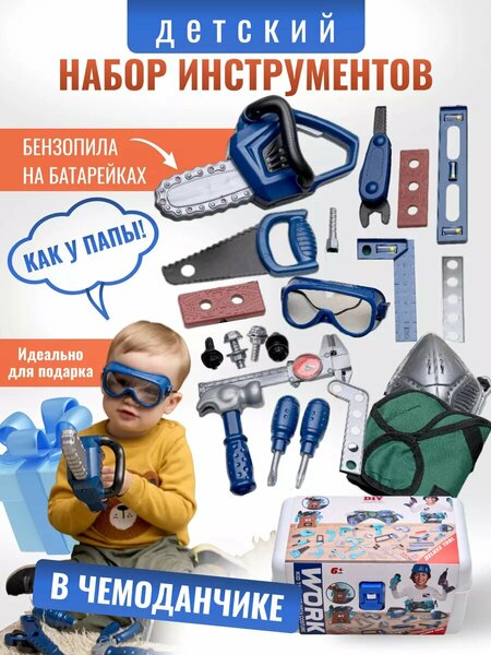 Набор игрушечных инструментов подарочный для мальчика, 2+ Набор игрушечных инструментов подарочный для мальчика,2+ представляет собой уникальный ящичек с реалистичными тематическими инструментами, предназначенный для сюжетно-ролевых игр. Прокачайте мелкую моторику, ловкость, точность и внимательность вашего ребенка с помощью этого набора. Размер приспособлений подобран с учетом комфортного хвата детских ручек. Заветный чемоданчик познакомит ребенка с миром строительных профессий и подарит положительные эмоции. Ведь дети, довольно часто, хотят такие же инструменты, как у папы! Это тот счастливый случай, когда набор, как у папы, но безопаснее и интереснее. Комплект продуман до мелочей, в нем вы найдете бензопилу или шуруповерт, имитирующий работу настоящего инструмента, но не тревожащий соседей; уровень и штангенциркуль; две отвертки с насадками, молоточек; защитную маску и визитку с контактами вашего маленького мастера, а также другие нужные инструменты для малыша. Игрушки выполнены из качественных и безопасных материалов и станут великолепным подарком для детей на День Рождения, Новый год, Рождество и любой другой праздник. Тип батареек: АА Эффекты: имитация работы инструмента Эффекты: звук Эффекты: двигательные Количество батареек для работы, шт: 2 Типоразмер элемента питания: AA Материал изготовления: пластик Цвет товара: синий Минимальный возраст: 1.0