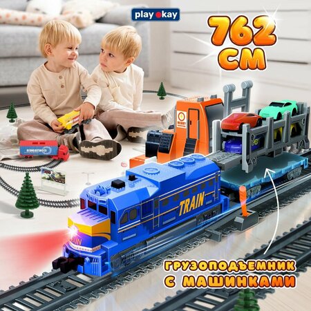 Железная дорога детская с электропоездом Play Okay игровой набор - поезд с вагонами и ЖД погрузчик с машинками, дорожные знаки и стоп-кран, игрушка для мальчиков развивающая - 762 см