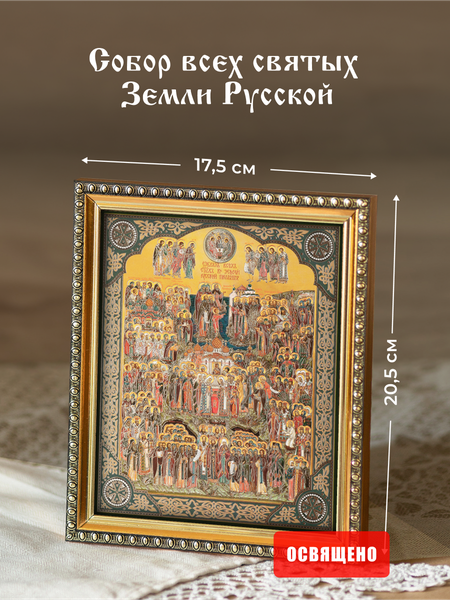 Икона «Собор всех святых, в земле Российской просиявших» была создана в честь русских святых, оказавших значительное влияние на духовную жизнь нашей страны. Образ "Собор всех святых земли Русской" глубоко почитается верующими. Церковный праздник возник в середине XVI века как ответ на традицию почитания святых из других христианских стран. Русские святые, совершившие духовные подвиги, были достойны особого уважения, и этот праздник стал неотъемлемой частью духовной жизни Руси. Однако со временем он был забыт и вновь возродился только в начале XX века, при императоре Николае II. Это произошло в 1918 году, сразу после революции и начала гонений на Церковь. Икона разделена на несколько уровней. Верхняя часть символизирует небесное, духовное измерение, где пребывают святые в славе Божией. Нижняя часть представляет людской мир, где жили и трудились святые, прославившие землю Русскую. В центре иконы располагается алтарь с Библией и икона Богородицы со Спасителем, как связь всего божественного и мирского через молитву и почитание. Каждый святой изображён с нимбом, подчеркивая его святость и духовное состояние. Центральные фигуры включают важнейших русских святых: князья-мученики, преподобные и святители, такие как Сергий Радонежский, Серафим Саровский и другие. Например, среди мучеников можно выделить князей Бориса и Глеба – первых русских святых. Преподобные представлены основателями монашества и великими аскетами Руси. В целом на «Собор всех святых, в земле Русской просиявших» присутствуют разные категории святых: мученики, князья, святители, монахи, юродивые и праведные миряне. Святые сгруппированы в соответствии с их духовным статусом и местом канонизации. Монахи и святители находятся рядом с князьями и мучениками, что означает общую связь всех святых в духовной иерархии. На фоне этих групп можно увидеть изображения белокаменных храмов, символизирующих святые места Руси. Перед иконой молятся о духовной поддержке, заступничестве перед Богом, спасении души, мире и благополучии. Этот образ часто используется для молитв о защите Отечества, о помощи в тяжелые времена и сохранении веры. Дата почитания – переходящий (второе воскресенье после Троицы). Освященная икона идеально подходит для дома и домашнего иконостаса. Она выполнена в традиционном стиле, прекрасно подойдет для домашней молитвы. Благодаря своему уникальному дизайну и высокому качеству, она станет отличным подарком для ваших близких на любой праздник, будь то Крещение, Рождество, День Рождения или любой другой торжественный день. Изображение иконы выполнено с использованием полиграфической печати с золотым тиснением, которое придаёт иконе церковную величественность. Тонкий слой ламинации надежно защищает изображение от внешних воздействий. Расположено в рамке со стеклом. Размер печатного изображения освященной иконы 15х18 см. Размер рамки 17,5х20,5 см. Икона освящена в Домовой Церкви при нашей мастерской священнослужителями Санкт-Петербургской епархии. Упакована в брендированную коробку из трехслойного гофрокартона. Для того, чтобы ознакомиться с нашим ассортиментом нажмите на логотип духовный наставник в карточке товара. А чтобы не пропустить появление новинок Вы можете подписаться на нашу православную мастерскую, нажав на «сердечко».