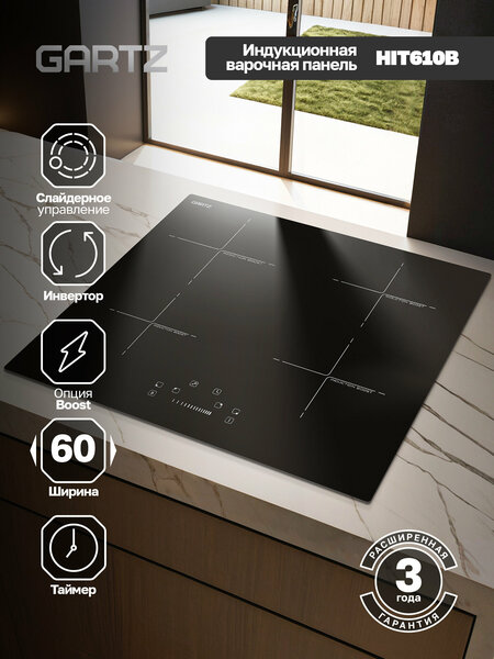 Варочная панель индукционная встраиваемая GARTZ HIT610B QuadroCook — это инновационная и безопасная варочная панель, которая обеспечит высокую эффективность и удобство в процессе готовки, добавляя современный стиль в вашу кухню.