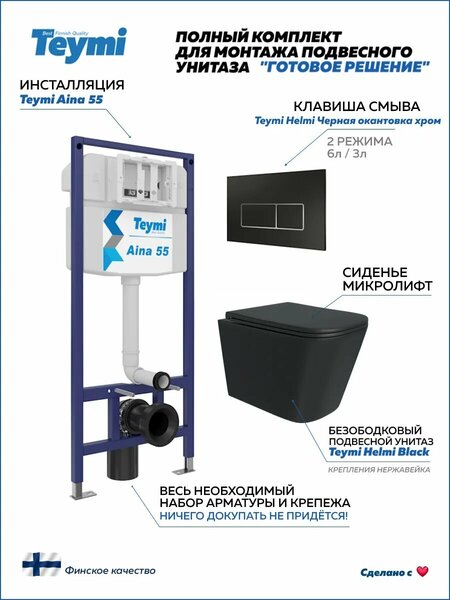 Комплект «Готовое решение» для установки инсталляции с подвесным унитазом: -- инсталляция TEYMI AINA 55 T70035 – монтажная рама из цельного стального профиля прямоугольного сечения, позволяющая выдерживать нагрузки до 400 кг. Габаритная ширина рамы 470 мм; -- цельнолитой бесшовный бачок скрытого монтажа; -- клавиша смыва TEYMI HELMI T70205, цвет черный матовый, окантовка хром; -- унитаз подвесной безободковый TEYMI HELMI S черный T40302MB; -- сиденье с микролифтом; -- полный комплект арматуры для монтажа: уплотнительные кольца, манжеты, труба смыва, фановый отвод с удлинителем, защитный кожух ревизионного окна с крепежной рамкой, закрывающей панелью и крышкой; -- полный комплект крепежа для установки: крепеж к стене, шпильки для унитаза, крепежная рамка, соединительные шпильки, толкатели, фиксаторы; -- инструкция по установке и обслуживанию. Преимущества комплекта: -- полная (максимальная) комплектация для установки - больше ничего докупать не придётся; -- все составляющие комплекта идеально подходят друг к другу; -- рама покрыта суперпрочной порошковой краской синего цвета с антикоррозионными свойствами; -- высота монтажной рамы может регулироваться с помощью ножек из оцинкованной стали; -- универсальный монтаж – межосевое расстояние под шпильки для подвесного унитаза 180 и 230 мм – подходит ко всем подвесным унитазам; -- сливной бачок скрытого монтажа, изготовленный из полиэтилена низкого давления, рассчитан на 200 тысяч циклов смыва, а цельнолитая бесшовная конструкция позволит работать без протечек в течение всего периода эксплуатации; -- 2-режимный слив 3 / 6 л с возможностью регулировки; -- лёгкость обслуживания бачка благодаря ревизионному окну, скрытому за клавишей смыва; -- гарантия 10 лет на весь комплект и 50 лет на стальную раму. Размер изделия: высота 1130 мм (регулируется) Х ширина 470 мм Х глубина 102 мм. Уважаемые покупатели, обращаем ваше внимание на то, что система инсталляции TEYMI AINA 55 может быть также укомплектована другими клавишами смыва или подвесными унитазами от бренда TEYMI (вы можете найти их на этом сайте по указанным артикулам). Предлагаем вам рассмотреть варианты сочетания со следующими клавишами: : HELMI хром T70202CH : HELMI черная T70203BM : HELMI белая T70018WM : HELMI нержавеющая сталь T70204 : HELMI черный матовый T70205 : HELMI белый глянцевый T70206 : LINA хром T70102CH : LINA черная T70103BM : LINA белая T70019WM : LINA нержавеющая сталь T70104 : LINA черный матовый T70105 : LINA белый матовый T70106 : AINA хром T70012CH : AINA черная T70013BM : AINA белая T70020WM : AINA нержавеющая сталь T70014 : KATI хром T70701CH : KATI черная T70702BM : KATI белая T70021WM : ELLIE хром T70022CH : ELLIE черная T70023BM : ELLIE белая T70024WM Также просим обратить взгляд на наши лучшие безободковые подвесные унитазы: : SOLLI T40201 : LINA S T40102 : HELMI S T40302 : HELMI VORTEX T40303 : IVA T40601 : ELLIE T40802 : LINA MEDIA T40105 : KATI T40701 : HANNA PRO T40901 : HELMI S BLACK T40302MB : VITRA PRO T40806 : VITRA T40804 : DEMI T40208 : LINA VORTEX T40110 : RITTA T40809 : LINA PRO T40106 : LINA S BLACK T40111