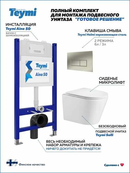 Комплект «Готовое решение» для установки инсталляции с подвесным унитазом: -- инсталляция TEYMI AINA 50 T70033 – монтажная рама из цельного стального профиля прямоугольного сечения, позволяющая выдерживать нагрузки до 400 кг. Габаритная ширина рамы 525 мм; -- цельнолитой бачок скрытого монтажа, обшитый кожухом из пенопласта; -- клавиша смыва TEYMI HELMI T70204, корпус из нержавеющей стали, цвет нержавеющая сталь матовый; -- унитаз подвесной TEYMI Solli T40201; -- быстросъёмное сиденье с микролифтом; -- полный комплект арматуры для монтажа, включающий в себя уплотнительные кольца и манжеты, трубу смыва, фановый отвод с удлинителем, защитный кожух ревизионного окна с крепежной рамкой, закрывающей панелью и крышкой; -- полный комплект крепежа для установки, а именно: крепеж к стене, шпильки для унитаза, крепежная рамка, соединительные шпильки, толкатели; -- инструкция по установке и обслуживанию. Преимущества комплекта: -- полная (максимальная) комплектация для установки - больше ничего докупать не придётся; -- все составляющие комплекта идеально подходят друг к другу; -- рама покрыта суперпрочной порошковой краской синего цвета с антикоррозионными свойствами; -- высота монтажной рамы может регулироваться с ходом до 20 см с помощью ножек из оцинкованной стали; -- универсальный монтаж – межосевое расстояние под шпильки для подвесного унитаза 180 и 230 мм – подходит ко всем подвесным унитазам; -- сливной бачок скрытого монтажа, изготовленный из полиэтилена низкого давления, рассчитан на 200 тысяч циклов смыва, а цельнолитая бесшовная конструкция позволит работать без протечек в течение всего периода эксплуатации; -- 2-режимный слив 3 / 6 л с возможностью регулировки; -- кожух из пенопласта защищает бачок от возникновения конденсата и создаёт дополнительную шумоизоляцию; -- лёгкость обслуживания бачка благодаря ревизионному окну, скрытому за клавишей смыва; -- гарантия 10 лет на весь комплект и 50 лет на стальную раму. Размер инсталляции с бачком: высота 1055 мм Х ширина 525 мм Х глубина 96 мм. Уважаемые покупатели, обращаем ваше внимание на то, что система инсталляции TEYMI AINA 50 может быть также укомплектована другими клавишами смыва или подвесными унитазами от бренда TEYMI (вы можете найти их на этом сайте по указанным артикулам). Предлагаем вам рассмотреть варианты сочетания со следующими клавишами: : HELMI хром T70202CH : HELMI черная T70203BM : HELMI белая T70018WM : HELMI нержавеющая сталь T70204 : HELMI черный матовый T70205 : HELMI белый глянцевый T70206 : LINA хром T70102CH : LINA черная T70103BM : LINA белая T70019WM : LINA нержавеющая сталь T70104 : LINA черный матовый T70105 : LINA белый матовый T70106 : AINA хром T70012CH : AINA черная T70013BM : AINA белая T70020WM : AINA нержавеющая сталь T70014 : KATI хром T70701CH : KATI черная T70702BM : KATI белая T70021WM : ELLIE хром T70022CH : ELLIE черная T70023BM : ELLIE белая T70024WM Также просим обратить взгляд на наши лучшие безободковые подвесные унитазы: : SOLLI T40201 : LINA S T40102 : HELMI S T40302 : HELMI VORTEX T40303 : IVA T40601 : ELLIE T40802 : LINA MEDIA T40105 : KATI T40701 : HANNA PRO T40901 : HELMI S BLACK T40302MB : VITRA PRO T40806 : VITRA T40804 : DEMI T40208 : LINA VORTEX T40110 : RITTA T40809 : LINA PRO T40106 : LINA S BLACK T40111
