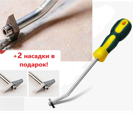 Инструмент предназначен для удаления старой затирки и засохшего клея между плиткой Острый наконечник из высокопрочной стали Справится с самой твердой затиркой, не повреждая плитку Удобно использовать под разным углом из-за изгиба рабочей части (шестигранный ключ в комплекте для затягивания винта рабочей головки) Удобная ручка с резиновым покрытием В подарок 2 шт сменных насадок!