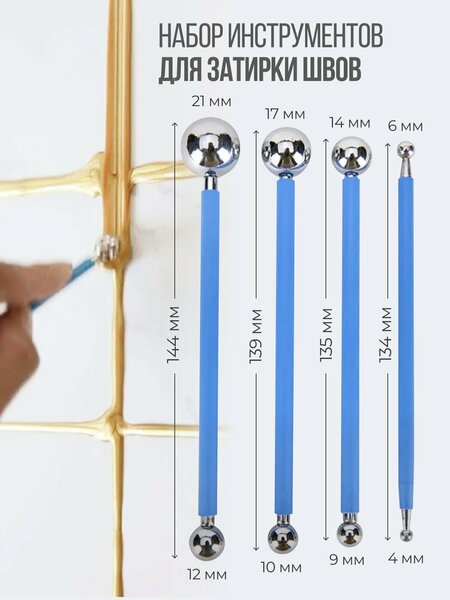 Инструмент для выравнивания плитки: 4 инструмента в наборе Набор инструментов для укладки плитки включает в себя 4 инструмента разного диаметра, что позволяет выполнять различные задачи по укладке плитки. Затирка для швов: 4 инструмента разного диаметра в наборе В комплекте вы получаете 4 инструмента для затирки швов, которые помогут вам аккуратно и быстро выполнить работу по укладке плитки. Материал и цвет Инструменты изготовлены из нержавеющего сплава, что при должном использовании и уходе обеспечивает их долговечность и устойчивость к коррозии. Серебристый цвет инструментов придает им стильный и современный вид. Упаковка и количество Набор включает в себя 4 инструмента разного диаметра, что позволяет вам выбрать наиболее подходящий для выполнения конкретной задачи. Выбирая эти инструменты для затирки плиточных швов, вы получаете надежный и качественный набор инструментов, который поможет вам выполнить работу быстро и аккуратно.