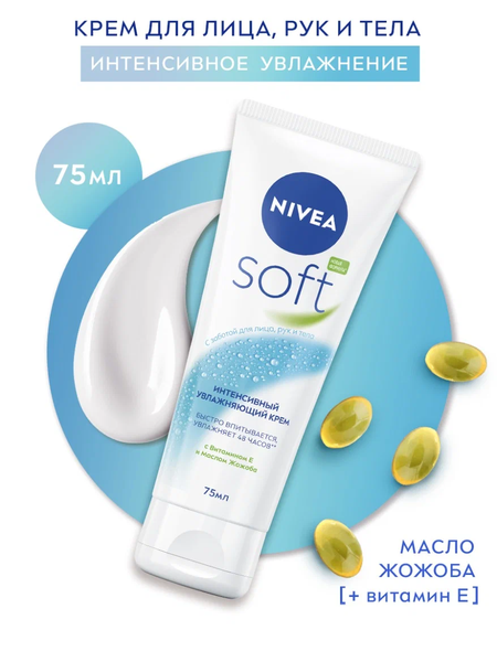 Интенсивный увлажняющий крем NIVEA Soft разработан для ежедневного ухода за кожей лица, рук и тела. Новая улучшенная формула* увлажняет 48 часов. Благодаря легкой текстуре с Витамином Е и Маслом Жожоба крем быстро впитывается и дарит Вашей коже ощущение нежности. Универсальный крем NIVEA Soft подходит для всех типов кожи. Попробуйте Интенсивный увлажняющий крем Soft от NIVEA и ощутите длительное освежающее увлажнение кожи. Дерматологически протестировано. Способ применения: нанесите небольшое количество крема на сухую чистую кожу лица, рук и тела аккуратными массирующими движениями. Повторяйте нанесение по мере необходимости. • Легкая текстура, быстро впитывается • Увлажняет 48 часов • С Витамином Е и Маслом Жожоба • Дерматологически протестировано • Для всех типов кожи Бренд NIVEA заботится о коже и планете, поэтому формула крема создана из 95% ингредиентов натурального происхождения