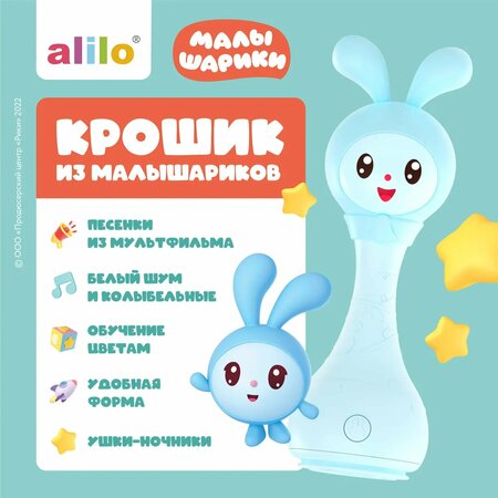 Это Крошик — интерактивная музыкальная игрушка и большой непоседа. Он поёт песенки, рассказывает сказки и учит малыша узнавать цвета. Весь контент от Малышариков, которые так нравятся деткам! Особенности Крошика: 40 Умных песенок и10 добрых сказок. Потрясите Крошика и он воспроизведёт 50 звуков из мира Малышариков. 15 спокойных мелодий помогут подготовить малыша ко сну. 9 цветных карточек в комплекте помогут малышу выучить цвета. Никаких батареек! Крошик работает от внутреннего аккумулятора и заряжается через USB. Корпус сделан из высокопрочного abs-пластика, который в 30 раз прочнее обычного. Ночник. Ушки переливаются разными цветами и светятся в темноте. Их можно грызть, так как они сделаны из мягкого и безопасного силикона. Гарантия 1 год! В комплекте: Инструкция 9 цветных карточек Аккумулятор Шнур USB Характеристики: Габариты: высота 15,5 см, ширина 5,5 см, глубина 5.5 см Вес: 190 гр. Все материалы прошли испытания и соответствуют стандартам и требованиям ЕС иСША, предъявляемым к безопасности игрушек. Гарантия: 1 год Возраст: 0-3 года