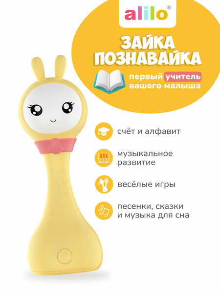 Приветики всем крохам и их заботливым родителям! ️ Хотите познакомить малыша с миром звуков? Тогда вот он я! Зайка Познавайка из большого дружного семейства зайцев alilo и настоящая волшебная игрушка! Я стану лучшим другом маленького исследователя с самого рождения. Со мной не бывает скучно - мы вместе с малышом отправимся в захватывающее путешествие по музыкальному миру. Будем слушать весёлые песенки и сказки днем, а вечером - сладко засыпать под спокойные мелодии и белый шум. Познакомимся со звуками, нотами и ритмом. Научимся правильно произносить числа и буквы и даже выучим алфавит! А еще я чувствую и реагирую на каждое потряхивание, взмах и переворачивание. Чтобы малыш весело, увлеченно и незаметно для себя развивал крупную моторику. Меня удобно держать в руках благодаря особой форме без острых краев. Почему вашему малышу точно стоит подружиться со мной: ⭐️ Мои братья и сестры уже живут в домах деток из 20 стран мира. ⭐ Я действительно умная игрушка - знаю 40 различных звуков, которые помогут малышу познакомиться с миром вокруг. ⭐️ Помогаю даже самым активным непоседам быстро и сладко засыпать по вечерам благодаря спокойным мелодиям и белому шуму. ⭐️ Любимую мелодию (или белый шум) можно поставить на повтор. Я буду играть без перерыва 45 минут, а потом усну. ⭐️ Пою 26 любимых песенок - в том числе песни В. Шаинского и Ю. Энтина про улыбку, облака, крокодила Гену, Мамонтенка и др. ⭐️ Рассказываю познавательные и интересные сказки голосами профессиональных актрис. ⭐️ Знаю игры для веселья (Повторюшка) и для развития крупной моторики (Кто трясет быстрее). ⭐️ Помогаю открывать музыкальные способности и таланты малыша с помощью 3-х музыкальных режимов. ⭐️ Мои ушки из безопасного гипоаллергенного силикона. ⭐️ Мне не нужны батарейки - я работаю 4 часа от аккумулятора. ⭐️ Я сертифицирован и проверен, меня можно ронять. Гарантия на меня составляет 365 дней после покупки! Я нравлюсь и мальчишкам, и девчонкам, поэтому меня смело можно дарить на День рождения, Новый год и просто так! ️ Я такой один, поэтому остерегайтесь подражателей и подделок. Малышу я буду полезным и весёлым другом, с которым он точно не захочет расставаться, а для мамы стану незаменимым помощником!