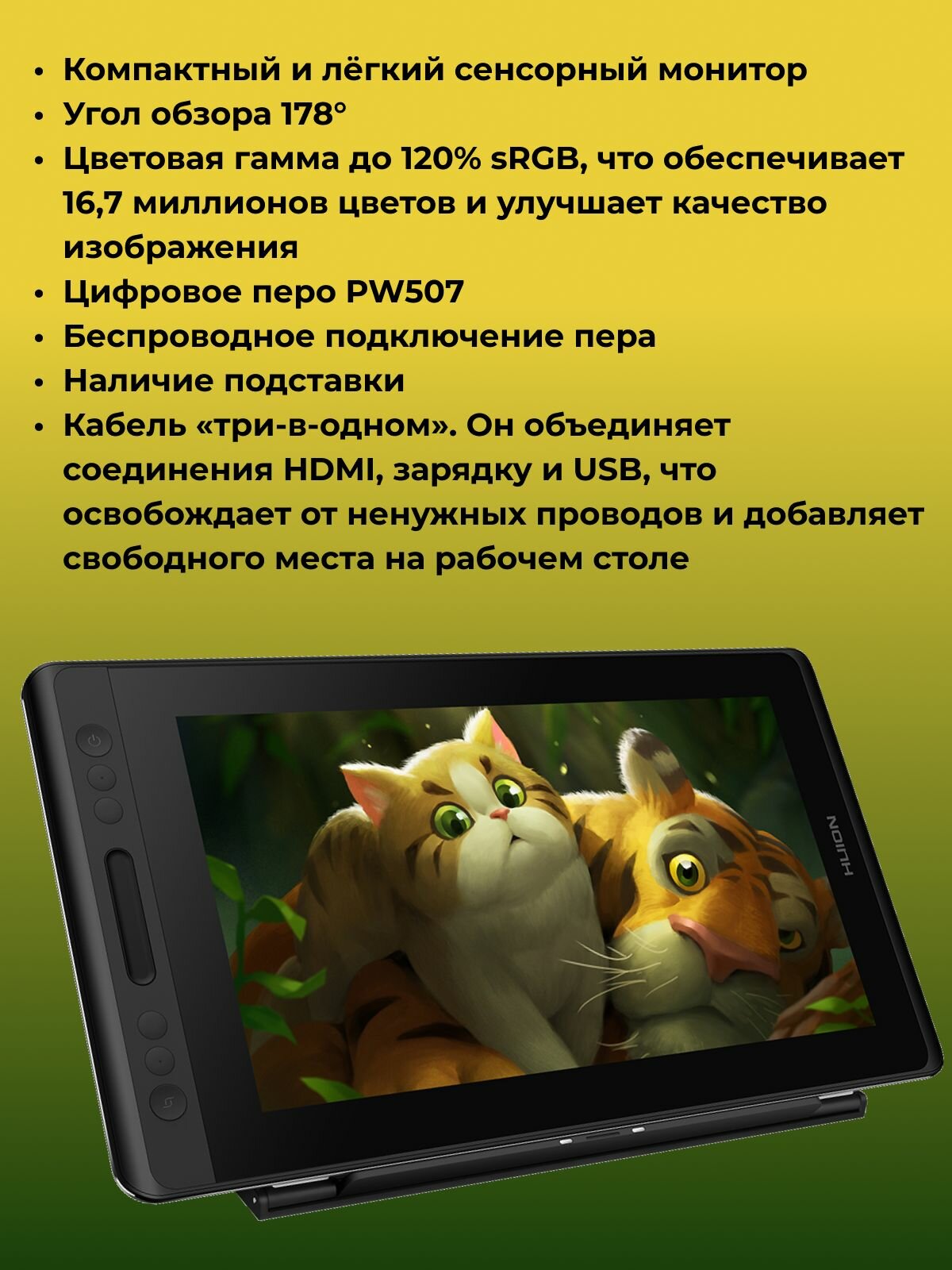 4 программируемые экспресс-клавиши и сенсорная панель; наклон пера: ±60°; максимальная высота работы пера: 10 мм; тип LCD матрицы: IPS; контрастность: 1000:1; яркость: 220cd/m2; время отклика: 25ms; совместимость: Windows 7 или выше, macOS 10.11 или выше, Linux