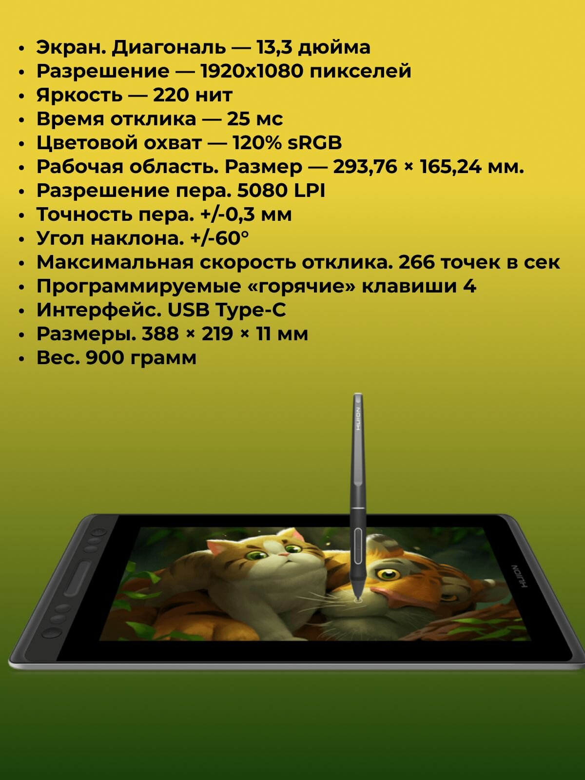 Графический планшет HUION Kamvas Pro 13 — это инновационное электронное устройство, которое станет незаменимым помощником для художников, дизайнеров и всех, кто занимается творчеством. Этот графический планшет с экраном позволяет создавать цифровые рисунки прямо на поверхности дисплея, что делает процесс рисования максимально естественным и комфортным. Планшет оснащен чувствительным пером-стилусом, который распознает до 8192 уровней давления, обеспечивая плавность линий и точность передачи деталей. Благодаря этому, графический планшет для рисования от HUION идеально подходит как профессионалам, так и начинающим художникам. Устройство совместимо с различными операционными системами, включая Windows и macOS, что делает его универсальным инструментом для работы на компьютере или ноутбуке. В комплекте идет удобный держатель для пера, что позволяет всегда держать стилус под рукой. Особенности HUION Kamvas Pro 13 Экран: Full HD дисплей с разрешением 1920x1080 пикселей обеспечивает четкость и яркость изображения. Стилус: безбатарейное перо с эргономичным дизайном и поддержкой наклона. Совместимость: поддерживает работу с популярными графическими редакторами, такими как Adobe Photoshop, Illustrator и Clip Studio Paint. Портативность: легкий и компактный дизайн позволяет брать планшет с собой куда угодно. Преимущества для пользователей Это графическое устройство является идеальным решением для цифрового искусства и дизайна. Оно позволяет воплощать идеи в жизнь с максимальной точностью и комфортом. Также планшет с экраном станет отличным помощником в учебе для студентов творческих специальностей, помогая развивать навыки рисования и дизайна. HUION Kamvas Pro 13 подойдет и для тех, кто увлекается рисованием и хочет попробовать себя в цифровом искусстве. Почему стоит выбрать HUION Kamvas Pro 13? Этот графический планшет для компьютера сочетает в себе высокое качество исполнения, функциональность и доступную цену. Он станет отличным подарком для художника или любого человека, увлеченного творчеством. Устройство также подойдет для работы и учебы, благодаря своей универсальности и удобству использования. Графический монитор HUION Kamvas Pro 13 — это мощный инструмент для творчества, который откроет новые горизонты в мире цифрового искусства. С ним вы сможете воплотить любые идеи, от простых набросков до сложных проектов. Это отличный выбор для тех, кто ищет надежный и функциональный графический планшет с экраном и стилусом. Основные характеристики Тип подключения: проводной Способ ввода: сенсорный/перьевой Разрешение: 5080 lpi Время отклика: 266 точек в секунду Размер планшета: 388х219х 11 мм Размер рабочей поверхности: 293.8х165.2 мм Вес: 0.91 кг Чувствительность к нажатию: 8192 Угол наклона пера: 60° Сменные насадки: есть Интерфейс: USB Видеоразъемы: HDMI Поддерживаемые ОС: Mac OS X, Windows 7, Windows 8, Windows 10 Напряжение питания: 5 В Комплектация: планшет, адаптер питания, документация, перо, подставка для пера, салфетка