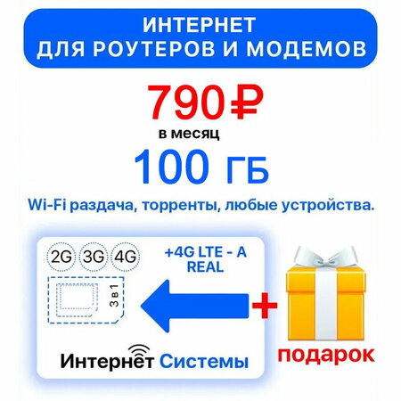 Интернет 100 ГБ + 2я сим карта в подарок! для Роутеров, Модемов всего за 790р./мес. Интернет Без ограничений по скорости (в любой сети) для раздачи Wi-Fi, торренты и для любых уст-в. Списание происходит в последний день месяца за следующий месяц. Активация сим карты 15 минут. Оформление в соответствии с законодательством РФ. Тарифный план действует на всей территории РФ, за исключением Дагестана КБР КЧР Крыма, ЛНР, ДНР, янао и Чукотский АО. Оператор колл-центра поможет не только активировать сим карту, но и настроить интернет в устройстве, которое вы используете. 7 дней в неделю для вас доступна наша тех. поддержка, при возникновении проблем с настройкой, подключением и работой сим карты звоните по номеру, указанному в инструкции. Ждем Ваш заказ!