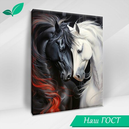 Интерьерная картина "Пара лошадей инь янь", арт данной картины отлично впишется в любой интерьер вашего дома, квартиры, офиса, дачи и тд. Размер картины 30/40 см. Комплектация картины состоит из: высококачественной интерьерной печати на синтетическом холсте компании Albeo; пигментные чернила; защитное лаковое покрытие, которое не позволит картине выгореть на солнце или испортиться после влажной уборки. Задняя часть картины-подрамника проклеена малярной лентой, крепеж картины крокодил PREMIUM класса, картина надежна обернута в стрейч и пузырчатую пленку, на обороте картины вы найдете инструкцию по уходу за картиной.