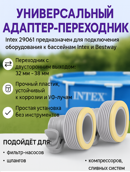 Intex Комплект переходников для бассейна 2 шт. (модель 29061) — универсальные соединительные элементы, предназначенные для подключения гофрированных шлангов диаметром 32 мм и 38 мм к насосам и фильтрующим системам бассейнов Intex и Bestway. Особенности: Тип переходника: "В" Подходит для: каркасных и надувных бассейнов Совместимость: шланги D32 мм ↔ D38 мм Комплектация: 2 переходника + уплотнительные прокладки Материал: пластик с резиновыми вставками Вес одного переходника: 0,25 кг Преимущества: Обеспечивает герметичное соединение шлангов разного диаметра; Простой монтаж без инструментов; Устойчив к хлору и ультрафиолету; Подходит для фильтров, насосов, сливных и оросительных систем.