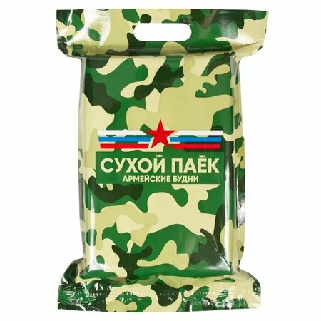 Вариант комплектации Сухого Пайка "тревожный" ИРП-Т Армейские Будни (суточный). Срок годности - 2 года Вес - 1.8 кг Состав : Каша рисовая с говядиной ГОСТ 250 г - 1 шт. Каша гречневая с говядиной ГОСТ 250 г - 1 шт. Каша перловая с говядиной ГОСТ 250 г - 1 шт. Паштет печеночный ГОСТ 100 г - 1 шт. Икра из кабачков ГОСТ 100 г - 1 шт. Галеты армейские из муки пшеничной 1 сорта 200 г - 4 шт. Повидло фруктовое-яблочное 45 г - 1 шт. Концентрат напитка тонизирующий 30 г - 1 шт. Чай черный 4 г - 2 шт. Кофе гранулированный 2 г - 1 шт. Сахар-песок 60 г - 3 шт. Соль 5 г - 1 шт. Перец черный молотый 1 г - 1 шт. Сливки сухие 2,5 г - 1 шт. Поливитамин 1 г - 1 шт. Разогреватель портативный (3 таблетки сухого спирта, металлический таганок) 50 г - 1 уп. Комплект спички водоветроустойчивые (6 шт.) - 1 уп. Таблетка для дезинфекции воды - 3 шт. Салфетка дезинфицирующая для рук - 3 шт. Салфетка бумажная - 3 шт. Ложка пластмассовая - 3 шт. Пищевая и энергетическая ценность Белки – 113 г Жиры — 195 г Углеводы – 390 г Энергетическая ценность – 3950 ккал. Сухие пайки очень удобны для любого автомобилиста, охотника и рыболова, в любом походе, для отдыха на природе, для пейнтболистов и страйкболистов, для туриста, для выживальщика и т. д! Многие люди просто держат их в машине, на даче, в гараже, подвале, дома, в рюкзаке на всякий случай, но при этом пользуются ими очень часто. В большинстве ИРП есть мясные, мясо-овощные и овощные консервы, каши, сыры, сало, рыба, повидло и фруктовые пюре, галеты из черного и белого хлеба. А также натуральные тонизирующие напитки, для экстренной подзарядки организма большой порцией энергии, во время усталости или экстремальных нагрузок. В случае если нет питьевой воды, в сухих пайках есть средства обеззараживания воды. А для поддержания здоровья и хорошего настроения в сухпае есть таблетка поливитаминов, шоколадка или шоколадная паста и жевательные резинки. Для разогрева продуктов, в комплекте сухпайка есть портативный разогреватель, а для разведения огня - спички спецназ, которые горят даже под водой. Всегда в комплекте также ложки, влажные и сухие салфетки, приправы и многое другое.