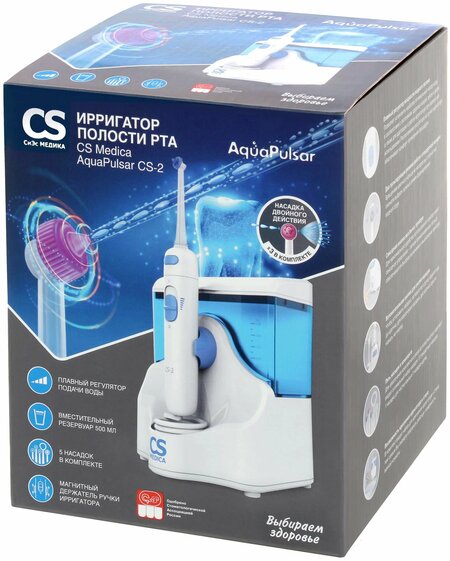 Ирригатор CS Medica AquaPulsar CS-2 - это устройство, предназначенное для комплексного ухода за полостью рта и межзубными промежутками. Он обеспечивает бережное очищение труднодоступных мест, массирует десны и усиливает циркуляцию крови, что способствует профилактике заболеваний десен. Прибор оснащен плавной регулировкой мощности потока, что делает его использование комфортным для каждого пользователя. Клавиша регулирования находится на ручке, позволяя менять мощность прямо во время процедуры. Ирригатор имеет два пульсирующих режима работы: "Струя" и "Спрей". Вместительный резервуар для растворов объемом 500 мл позволяет использовать прибор всей семьей без дозаправки. Прибор оборудован сенсорной кнопкой включения/выключения на корпусе, что делает его использование еще более удобным. Ирригатор CS Medica AquaPulsar CS-2 имеет эргономичный и стильный дизайн. Специальный крепеж к стене позволяет разместить прибор даже в небольшой ванной комнате. Прибор незаменим при ношении брекет-систем и ортопедических конструкций. Мощная точно направленная струя воды позволяет аккуратно чистить коронки, зубные протезы и брекеты. Для использования ирригатора рекомендуется использовать чистую теплую воду (до 40°C), предварительно очищенную через фильтр, и специальные растворы, показанные к применению в ирригаторе. После использования любых растворов промывайте ирригатор, чтобы препятствовать образованию отложений на внутренних частях прибора. Противопоказанием для использования ирригатора являются заболевания тканей пародонта в острой стадии и травмы слизистой оболочки полости рта в остром периоде. В комплект поставки входят 5 насадок разных цветов и типов, что позволяет каждому пользователю подобрать подходящий именно для него режим работы и интенсивность подачи водного потока.