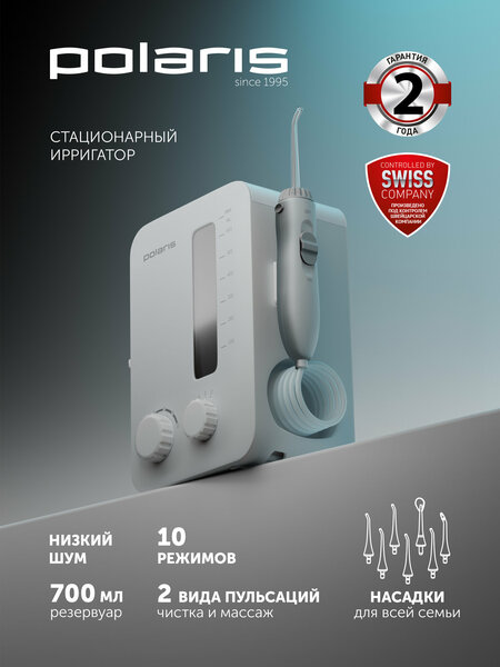 Стационарный ирригатор для всей семьи ∙ чистка межзубных промежутков, удаление налета напором воды в дополнение к зубной щетке; соблюдение гигиены при наличии имплантов, брекетов, коронок, мостов; для оздоровления десен с помощью массажа. ∙ 2 режима пульсаций: чистка и массаж. ∙ 10 режимов давления воды. ∙ Количество пользователей: от 1 до 4. ∙ Объем резервуара 700 мл. ∙ насадки в комплекте: 4 стандартные, 1 ортодонтическая, 1 пародонтологическая, 1 для языка. ∙ Номинальное давление воды в приборе: 175- 827 кПа. ∙ Частота пульсации воды 1400-1900 импульсов в минуту. ∙ Назначение: ежедневный уход за полостью рта. ∙ Автоматическое отключение через 4.5 минуты. ∙ Питание от сети. ∙ Хранение насадок в корпусе. Комплектация: Прибор 7 насадок Адаптер питания: вход 100–240В ~, 50/60 Гц, выход 12В 1.5А.