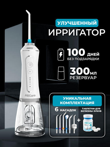 Ирригатор, 6 сменных насадок, руководство пользователя, кабель для зарядки, сумка для переноски, таблетки для ухода за полостью рта (30 шт.)