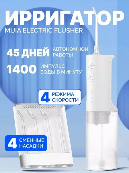 Профессиональный ирригатор Xiaomi - незаменимая модель для тщательного ухода за полостью рта. Он предназначен удалять остатки пищи и стойкий зубной налет в самых труднодоступных местах ротовой полости. В процессе очищения частички пищи удаляются, а десна получают массаж, благодаря импульсам пульсаций. Портативный ирригатор обладает следующими функциями: Глубокая очистка. Это возможность удалить застарелый зубной налет всего за 2 минуты. Таймер работы. Вам больше не нужно засекать время на гигиену зубов, через 2 минуты портативный беспроводной ирригатор для полости рта самостоятельно прекратит работу. Регулировка давления струи поможет выбрать оптимальный режим здесь и сейчас. Максимальное давление достигает 140 psi даже при низком заряде аккумулятора. В комплект входит 4 насадки: для струйной чистки, чистки языка, для десен и для брекетов. Стоматологический аксессуар является как детским, так и взрослым идеально его брать в дорожное путешествие. Наверняка, вы хотите найти ирригатор недорого. Стоимость модели оптимально сочетается с ее качеством.