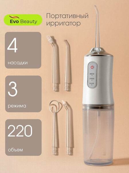 Портативный ирригатор для полости рта Evo Beauty - это устройство, которое обеспечивает профессиональную гигиену полости рта в домашних условиях. Он работает от встроенной аккумуляторной батареи и заряжается от USB-кабеля, что делает его удобным и мобильным. Ирригатор оснащен 4 многофункциональными насадками: классической, ортодонтической, пародонтологической и ложкой для чистки языка от налета. Вода под высоким давлением 80-130 psi пульсирующей технологией подается в полость рта, обеспечивая эффективную гигиеническую защиту и удаление зубного налета. Устройство имеет три режима работы: деликатный, нормальный и пульсирующий для массажа десен. Ирригатор может работать в автономном режиме до 30 минут, что обеспечивает мобильность использования. Водонепроницаемость IPX7 позволяет использовать устройство в душе или ванной. Портативный ирригатор Evo Beauty изготовлен из безопасных материалов и безопасен для десен. Он оснащен большим резервуаром для воды (220 мл) и эргономичным дизайном, который придется по вкусу каждому. Ирригатор подходит для взрослых и детей, а также для использования с брекетами и имплантами. В комплект входит 4 насадки, что позволяет использовать устройство всей семьей. Ирригатор Evo Beauty - отличный подарок для тех, кто заботится о здоровье своих зубов и полости рта.