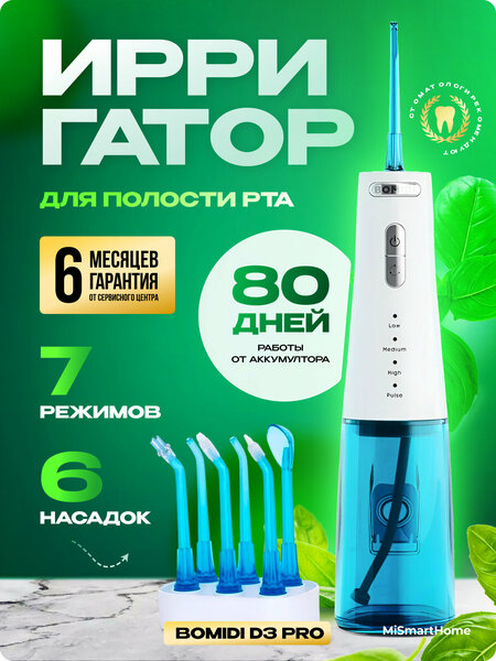 Bomidi D3 Pro - имеет 7 режимов работы, водонепроницаемый корпус, 1400-1800 мощных пульсирующих струй в минуту. Ирригатор помогает очистить ту часть зубов, с которыми не может справиться зубная щётка. Чистка не занимает много времени, и отлично защищает ваши зубы. Гипоаллергенные материалы Bomidi D3 Pro успешно прошел сертификацию FDA*, которая подтвердила безопасность материалов, используемых в устройстве. Благодаря высокому качеству и строгому контролю каждого этапа производства, таким ирригатором можно пользоваться даже беременным женщинам и маленьким детям. После стандартной чистки зубов, остается около 40% «слепых зон», которые практически невозможно очистить без использования ирригатора. Долгосрочные проблемы неправильной чистки зубов Скопление бактерий в полости рта вызывает покраснение и воспаление десен. Плохое удаление грязи вокруг коронок и брекетов стимулирует появление неприятного запаха и других стоматологических проблем. Частички пищи в зубах делают вид неопрятным и мешают Вам чувствовать себя уверенней в обществе. Разные насадки для разных случаев Стандартный режим + Стандартная насадка- Стандартный режим в комбинации со стандартной насадкой позволяют избавиться от частичек еды в пространстве между зубами, а также эффективно удаляют неприятный желтый налет. Режим защиты десен + Пародонтальная насадка -Щадящий режим для чувствительных зубов позволяет бережно очистить полость рта, не вызывая кровотечения и воспаления десен. Точечный режим + Ортодонтическая насадка-Особый точечный режим отлично подходит для пользователей с брекетами, позволяя полностью очистить их от скопившихся загрязнений и бактерий. Режим защиты десен (с выбором мощности) + Насадка для языка-Используется для поверхностной очистки языка и удаления неприятного запаха изо рта. Для поддержания стабильного потока Bomidi D3 Pro оснащен собственным интеллектуальным чипом, который точно контролирует рабочее давление устройства и обеспечивает подачу стабильной струи воды диаметром 0.6 мм. Благодаря высокому давлению, такая струя проникает даже в самые труднодоступные места и производит тщательную очистку полости рта. Удобство-Небольшой размер и удобство переноски позволит вам брать устройство в любое место. Вы сможете очистить любой тип зубов - нормальные или деформированные, при использовании брекетов или других средств формирования правильного прикуса. Каждый из режимов соответствует различному уровню давления воды, что идеально подойдёт для людей с различной чувствительностью зубов. Характеристики: Модель: D3 Pro Степень водонепроницаемости: IPX7 Объем: 300мл Тип: Ирригатор для полости рта Цвет: Голубой Время автономной работы: до 80 дней Источник питания: Перезаряжаемый аккумулятор Тип разъема для зарядки: Type-C Кабель в комплекте