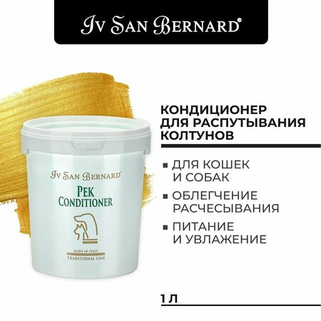 Кондиционер Iv San Bernard Traditional Line Pek для распутывания колтунов 1 л Средство для борьбы с колтунами. Придает эластичность, устраняет сухость и способствует поддержанию правильного баланса влажности в коже и шерсти. Оживляет шерсть, способствует объему. Способ применения: нанести средство на 3 мин, разобрать колтун руками или расческой, при необходимости надрезать ножницами по росту шерсти, вымыть шампунем, сушить и расчесать. Подготовка к выставке: растворить 30-50 гр. средства «ПЕК» в 250 мл. теплой воды. Нанести раствор на шерсть из пульверизатора, сушить, не смывать.